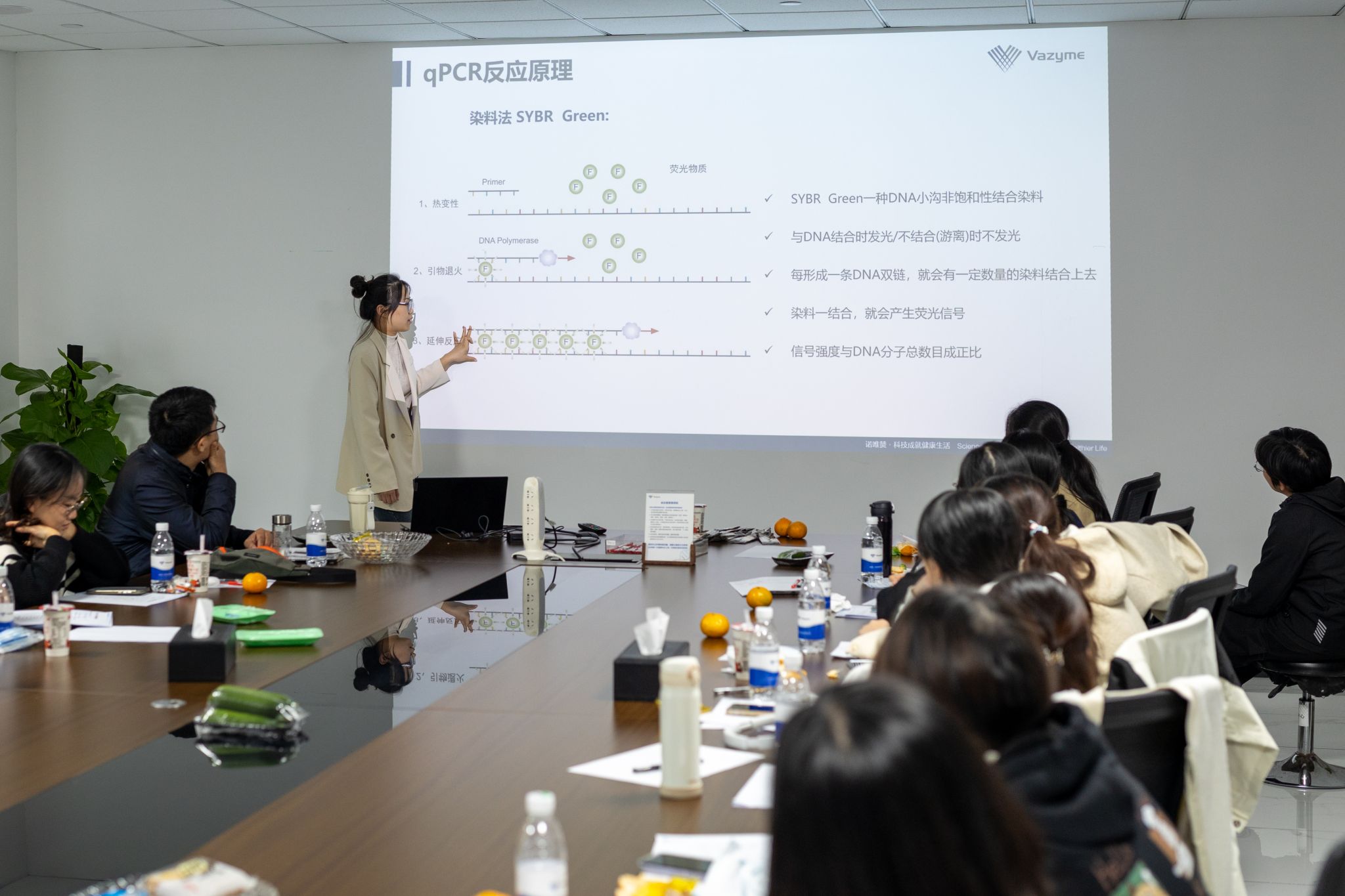 下午的学习重点是荧光定量PCR技术。在工程师的讲解中,同学们系统学习了qPCR的实验原理、操作规范及注意事项,并参与了qPCR体系配置及上机实验。在完成实验后,工程师带领同学们分析实验数据,针对曲线偏差问题展开讨论,帮助同学们理解实验中误差产生的原因及解决方法。随后,工程师还进行了荧光定量技术原理的专题讲解,使同学们在理论与实践中建立了更紧密的联系。