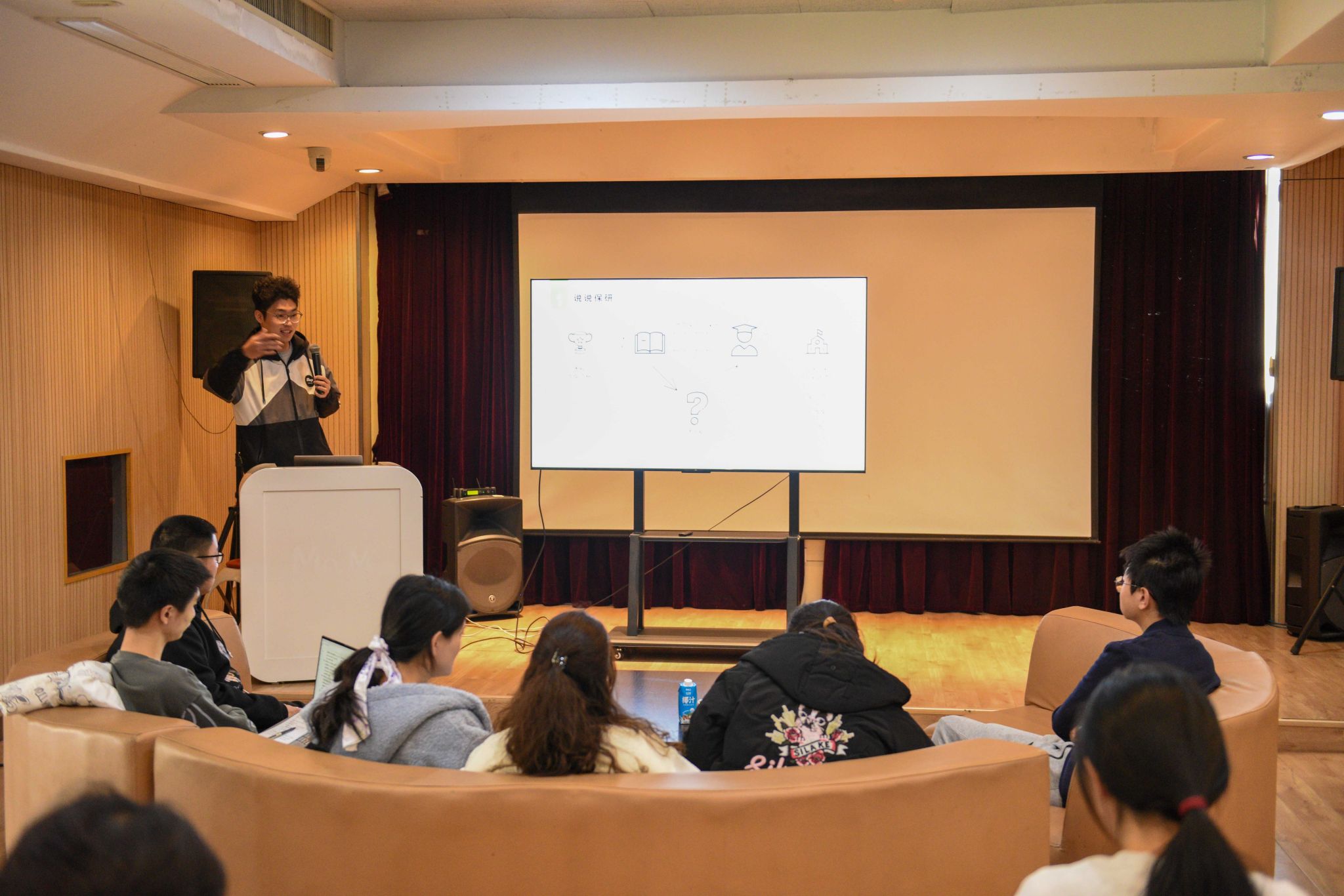 第二位主讲人、已保送至北京大学的大四学生芸真秧宗,介绍了参加夏令营的内容。芸真秧宗建议,夏令营与期末考试周可能会有冲突,建议学生合理安排,避免时间冲突。