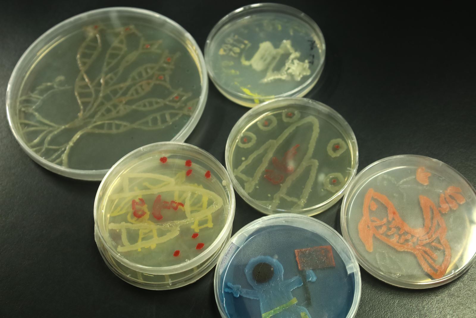 在南京农业大学建校120周年和生科院建院20周年之际,弓奕组将120以数字的形式表现在自己的作品中,以微生物绘画创作的方式为母校生日献礼。徐珂组的作品“月下棹神舟,星夜赴天河”展现了对母校发展的美好祝愿。耿溥泽组的作品“手可摘星辰”则是巧妙地融入了北斗七星、DNA双螺旋结构、神经元的形象,除常规微生物培养外,还使用了噬菌斑和荧光微生物进行创作,在紫外线的照射下可呈现出另一番美丽的景象。