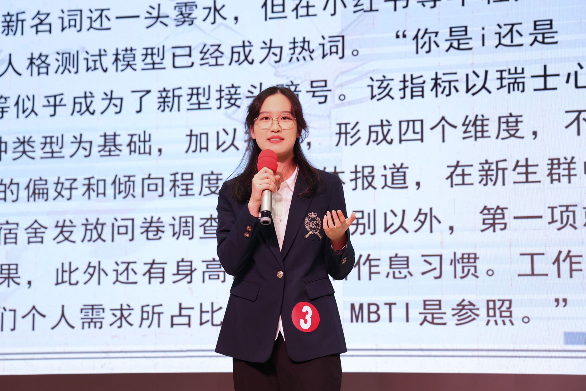 比赛的流程是:“主题演讲”、“切中利弊”及“浮想联翩”。八位选手为观众带来了一场有声有色的演讲比赛。1号选手朱景阳辨析努力与内卷;2号选手孙汇梓提出“利用钝感力应对生活中困境”;3号选手曹雅宁拨开精神内耗的迷雾,指出找回自我的归途;4号选手苏厚盾点出“原生家庭”背后的温暖;5号选手李笃行提出“心钝则路宽”的观点;6号选手朱乐娱一针见血地指出内卷的核心,向在场观众提出“拒绝内卷,做好自己”的建议;7号选手王静茹结合自身冲破牢笼的经历,传递光明与力量;8号选手许瑞青提出“人生长跑拼的是钝感力”的观点。在“主题演讲”环节中,他们充分展示了自己的才能,热情饱满、情感真挚;在“切中时弊”环节中,各位选手轮番上场,针砭时弊,各抒己见,在场观众也积极参与讨论,展现南农学子风采;在“浮想联翩”环节中,他们驰骋想象,畅所欲言,碰撞出思想的火花。现场掌声迭起,比赛被层层推向高潮。