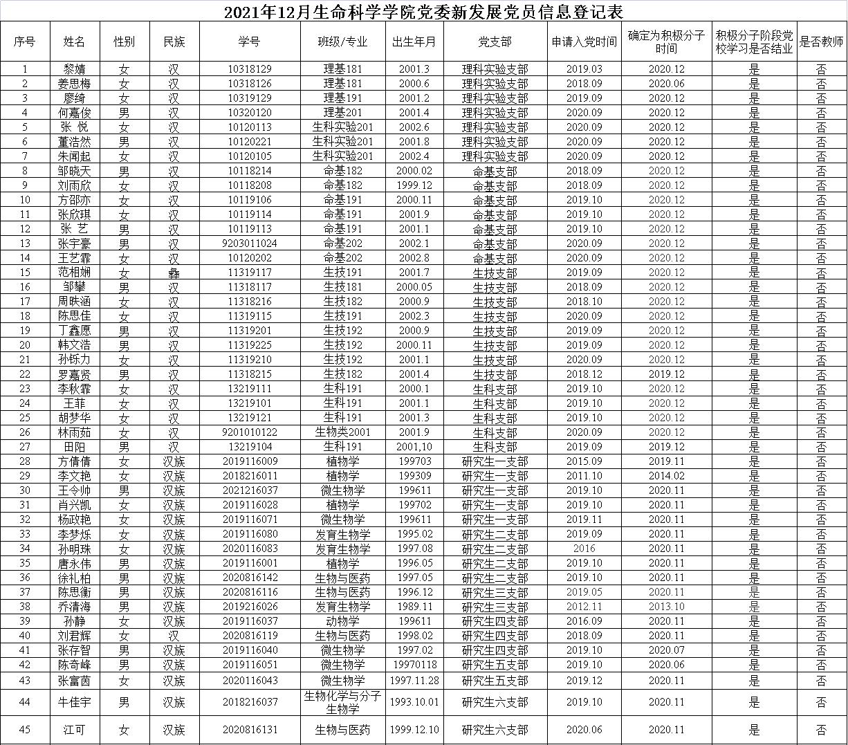 根据生命科学学院学生党员发展工作安排,经由各团支部推选,党支部讨论,结合个人成绩、综合测评以及获奖任职等综合表现,经院党委组织答辩、讨论审核,2021年12月拟发展预备党员45名,具体名单如下。 如有任何疑问,请在2021年12月24日前向学院团委、学院党委或校党委组织部反映。 联系电话:学院团委电话:84396673 学院党委电话:84395563