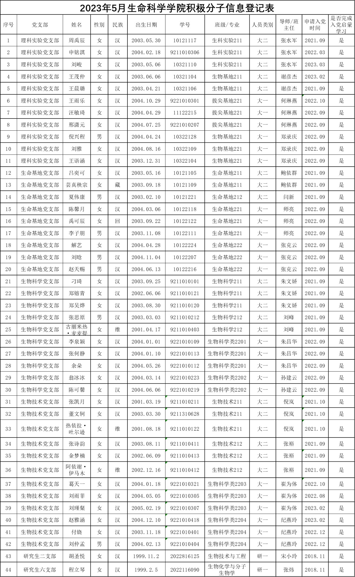 根据生命科学学院学生党员发展工作安排,经由各团支部推选,党支部讨论,结合个人成绩、综合测评以及任职、获奖等综合表现,现将2023年5月入党积极分子推优名单进行公示。