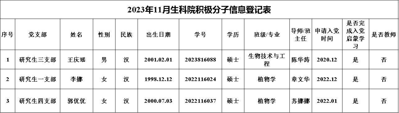 根据生命科学学院学生党员发展工作安排,经由各团支部推选,党支部讨论,结合个人成绩、综合测评以及任职、获奖等综合表现,现将2023年11月研究生入党积极分子推优名单进行公示。