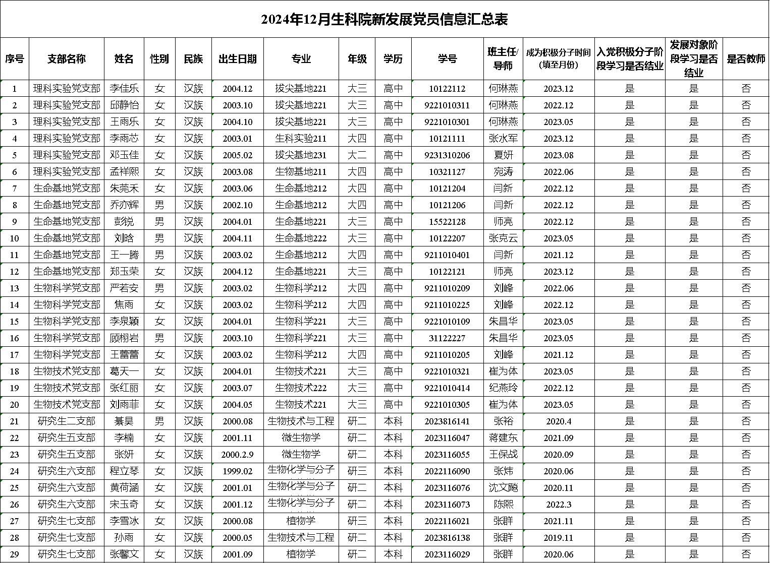 根据生命科学学院学生党员发展工作安排,经由党支部讨论,结合个人成绩、综合测评以及获奖任职等综合表现,经院党委组织答辩、讨论审核,2024年12月拟发展预备党员29名,具体名单如下。