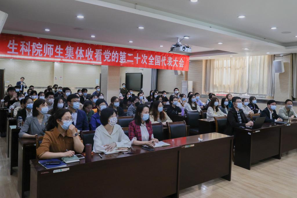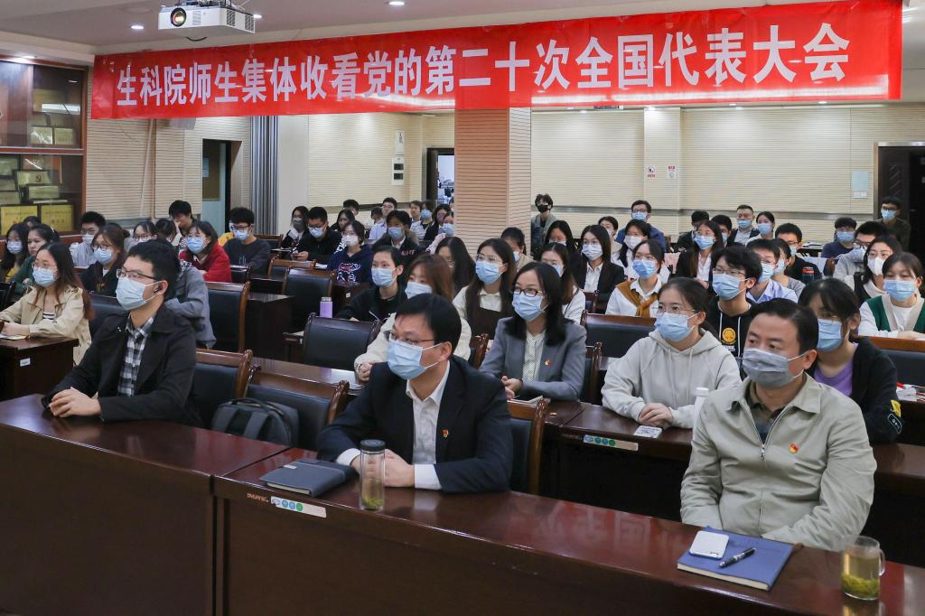 2022年10月16日上午10点,南京农业大学生命科学学院党委委员、党支部书记与副书记、2022年新发展党员及各支部党员与入党积极分子代表在E2004集体收看中国共产党的第二十次全国代表大会直播。