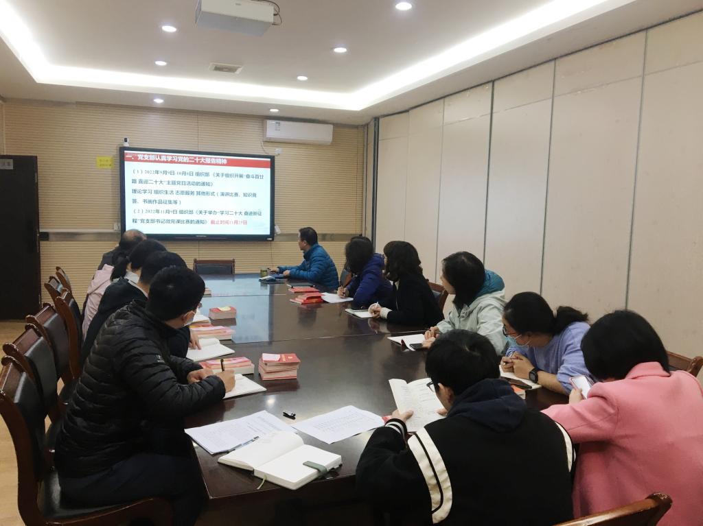 此次会议主要包括四个方面的内容。首先,根据校组织部的通知要求,重点部署认真学习党的二十大报告精神。赵书记强调要持之以恒做好党支部思想政治建设,把学习贯彻中国共产党的二十大精神作为当前和今后一个时期的首要政治任务,切实把思想和行动统一到党的二十大精神上来,深刻领悟“两个确立”的决定性意义,增强“四个意识”,坚定“四个自信”、做到“两个维护”。