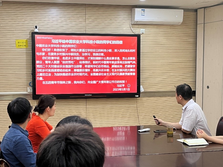 赵书记带领全体支部书记学习习近平给中国农业大学科技小院的同学们的回信。在信中,习近平总书记提出殷切期望,希望同学们志存高远、脚踏实地,把课堂学习和乡村实践紧密结合起来,厚植爱农情怀,练就兴农本领,在乡村振兴的大舞台上建功立业,为加快推进农业农村现代化、全面建设社会主义现代化国家贡献青春力量。