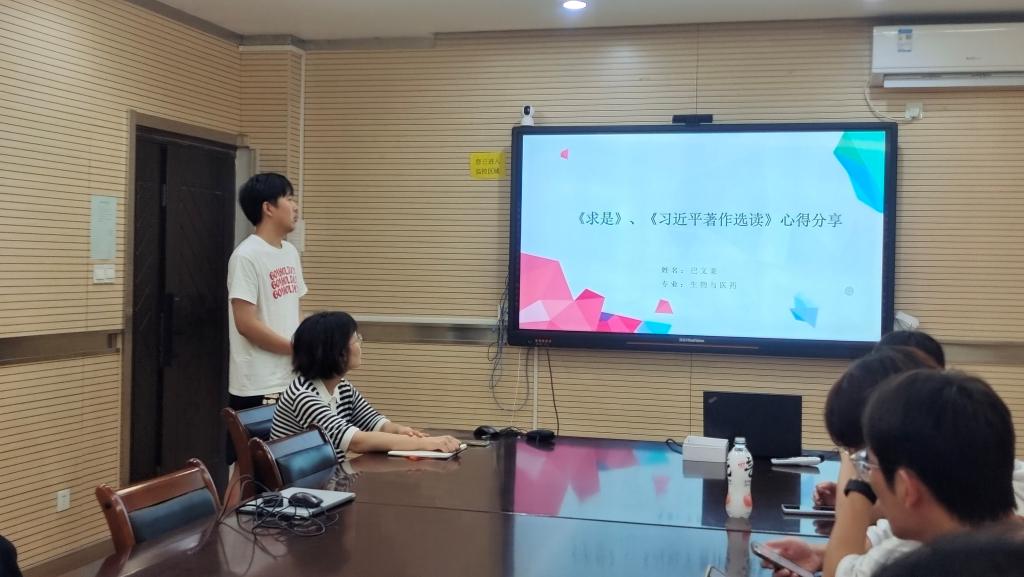 巴文豪同学认真研读《求是》、《习近平著作选读》,与大家分享读书心得,从保持对党忠诚、坚持群众路线,坚持自我革命三个方面进行论述。对党忠诚,是每个党员的必备品质,也是修身修为的实践过程,当代研究生党员应当有“人民立场”的思想意识,勇于自我革命,发扬中国共产党最鲜明的品格与优势。
