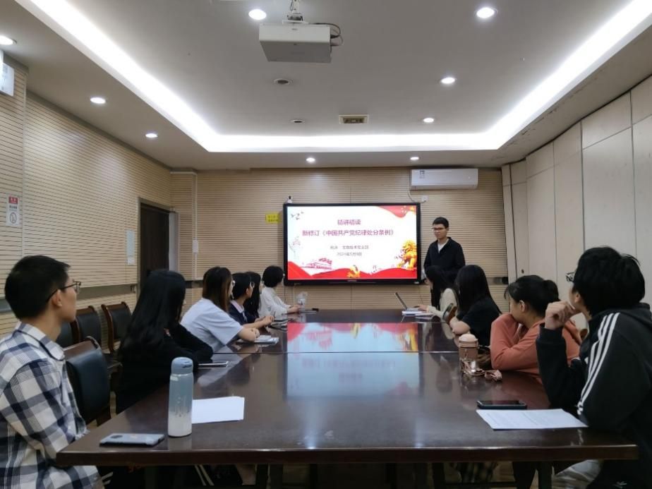 另一方面重点选择了《条例》中与大学生活相关度较高的第四十九至五十二条以及第一百五十三条与党支部成员进行了具体学习,强调了身为南农学生、以及党员自身所需要做到的本职工作,以使得党员能够明确是非界限、清楚自律标准、守住行为底线。