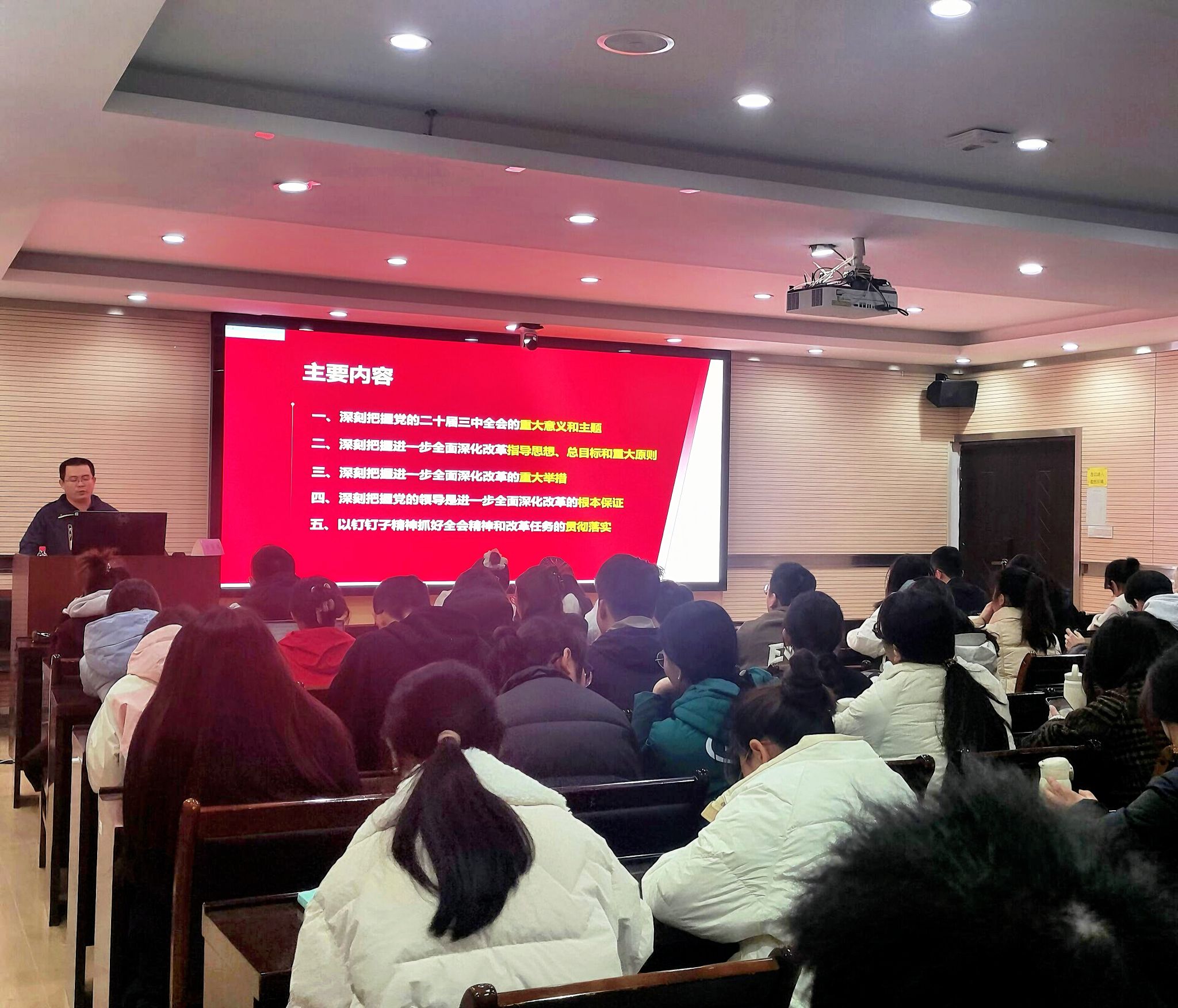 郑教授精心设计了五个方面的讲解内容:首先,他深入浅出地阐述了党的二十届三中全会的重大意义与鲜明主题。接着,他详细剖析了全面深化改革的指导思想、总体目标及应遵循的重要原则。随后,他系统讲解了全面深化改革的关键举措与实施路径;此外,郑教授还着重强调了党的领导在全面深化改革中的核心保障作用。最后,他鼓励大家以坚定的决心和实际行动贯彻落实全会精神,勇担改革重任。