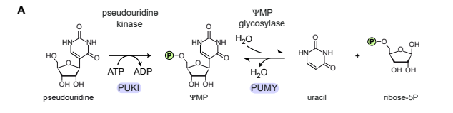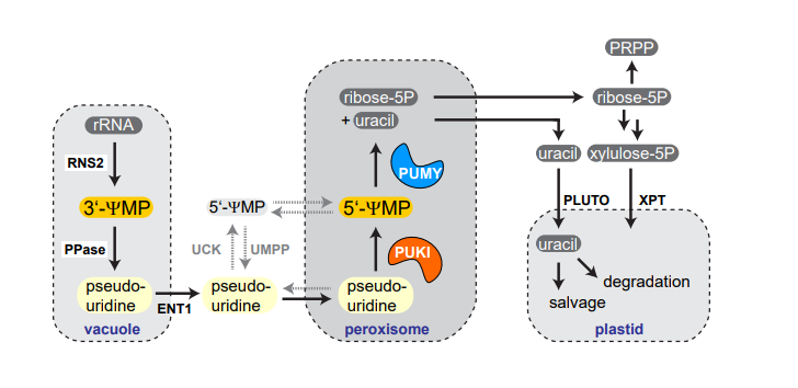 该论文中研究者发现,有别于哺乳动物(会将体内所产生假尿嘧啶通过泌尿系统排出),植物会利用两种特异性酶1)假尿嘧啶激酶(PUKI)和2)假尿嘧啶核苷酸水解酶(PUMY)一起工作,清除细胞内源性假尿嘧啶。具体为:PUKI先将假尿嘧啶磷酸化产生假尿嘧啶核苷酸,该产物随后被PUMY解和并水解为尿苷和5-磷酸核糖。