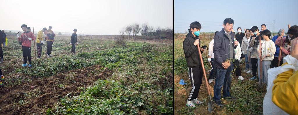 到达白马基地后,面对广阔的基地田野,在一边乘车参观基地一边聆听白马基地老师的介绍,同学们对号称“13500亩占地面积的大学”充满好奇和惊叹。园艺学院吴震教授在现场为同学们讲解了红薯的历史和产业价值以及农业生产相关知识。随后,同学们迫不及待的开始了挖红薯活动。平时端坐于教室内的莘莘学子此刻来到田间地头,扛起铁锹,亲自挖起了红薯。同学之间团结互助,分工明确,在辛勤的劳动中收获了知识与乐趣,切身感受了农民耕种时的艰辛。