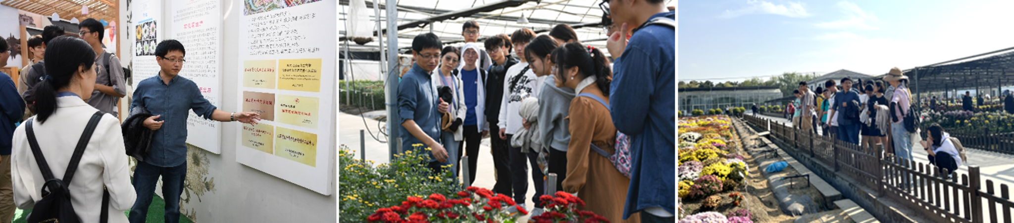 最后,同学们跟随老师的步伐来到了户外,成片的菊花如同海一般壮阔,充满着田园气息,让人感到惬意、悠然。畦垄之间展示各种菊花杂交品种的变异,不禁让同学们感叹遗传育种与种质创新的独特魅力。
