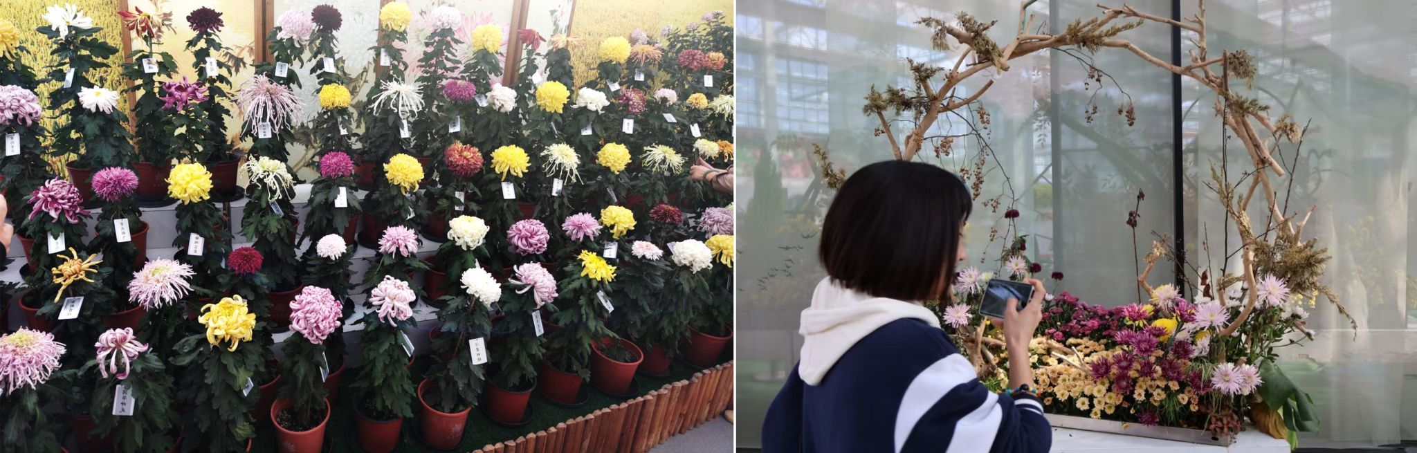 在菊花博览馆场景演绎区内,以“田园菊趣”为主题的盆景令人印象深刻。其采用农田文化元素,结合造型菊、盆景菊构筑湖熟的田园水乡景象,让我们真切地体会到置身大自然的乐趣。这些微型景观也展现了园艺师们的精湛技艺,让人惊叹不已!