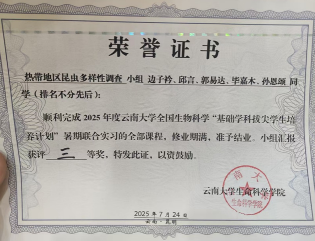 7月15日至25日,由云南大学生命科学学院主办的2025年全国生物科学“拔尖计划2.0”暑期联合实习在腾冲、西双版纳两地进行。来自厦门大学、复旦大学、北京大学、山东大学、南京农业大学、同济大学、兰州大学、云南大学等高校近30名师生共聚一堂,深入高黎贡山腹地和版纳热带雨林,围绕高黎贡山大型真菌、保护植物、药用植物以及版纳热带植物结构特征、昆虫多样性与人为干扰、鸟类多样性等六个实习专题展开探索。我院拔尖基地241班学生邱言、边子衿参加了本次联合实习的西双版纳小组“热带地区昆虫多样性调查及人类活动对昆虫多样性组成的影响初探”的专题。