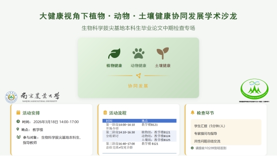 为践行生物科学拔尖基地“因材施教、强化基础、突出创新”的培养理念,落实拔尖人才“兼具科研素养、创新能力与责任担当”的目标,扎实推进毕业论文中期检查,近日,生命科学学院学术教授牵头举办“大健康视角下植物、动物、土壤健康协同发展”学术沙龙,特邀相关领域教师担任点评嘉宾,全体拔尖221班应届毕业生参与研讨。
