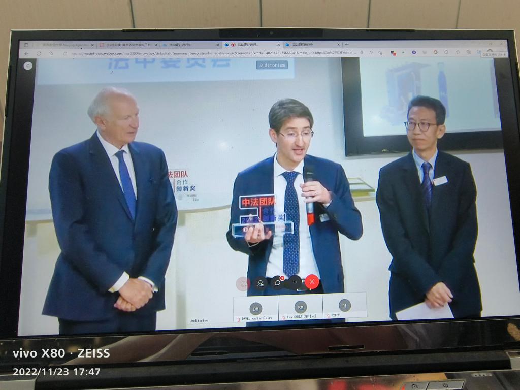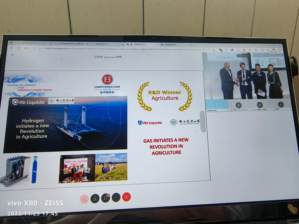 2022年11月23日,2022年度“中法团队合作创新奖”颁奖典礼在法国巴黎举行,法国前总理Jean-Pierre RAFFARIN(让-皮埃尔·拉法兰)发表开场致辞。我校沈文飚教授团队和法国液化空气集团(法液空)团队共同荣获“研发奖”(Innovation Awards for Franco-Chinese Teams-R&D Award),获奖项目为“Hydrogen Initiates a New Revolution in Agriculture”。该奖由中国驻法国大使馆科技参赞鲁荣凯先生颁发。