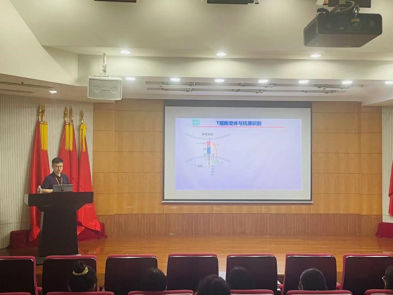 首先是研究生部程珍权老师为大家介绍了参会教师:研究生部主任马利,研究员赵祥,研究员杨荟,研究生部辅导员孔艺霖等。马主任给同学们介绍了生化所的基本详情并询问大家实习生活的感受,有什么疑问需要老师们解决的。接着,杨荟研究员和赵祥研究员分别为同学们讲授了各自研究领域的世界前沿研究进程。杨荟研究员给大家做了《Intracellular immunity:finding the enemy within 》的报告、赵祥研究员给大家做了《免疫受体的功能与工程改造》的报告。
