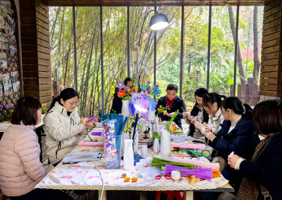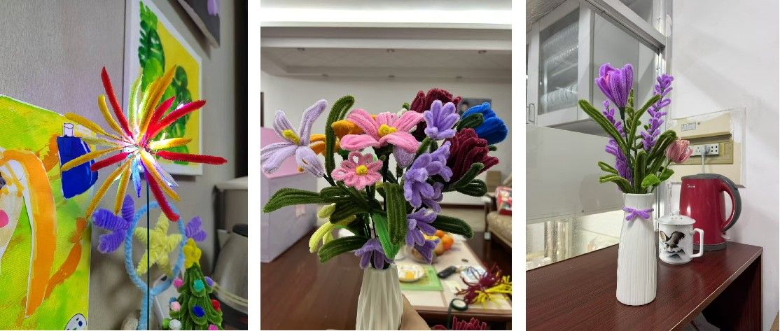 百合、柿柿如意、薰衣草、玫瑰,甚至风车跃然指尖,教工们用巧手点亮美好生活。活动当天恰逢青年教师叶现丰的生日,他收到手工制作的迎春花非常高兴,感受到了学院工会大家庭的温暖。