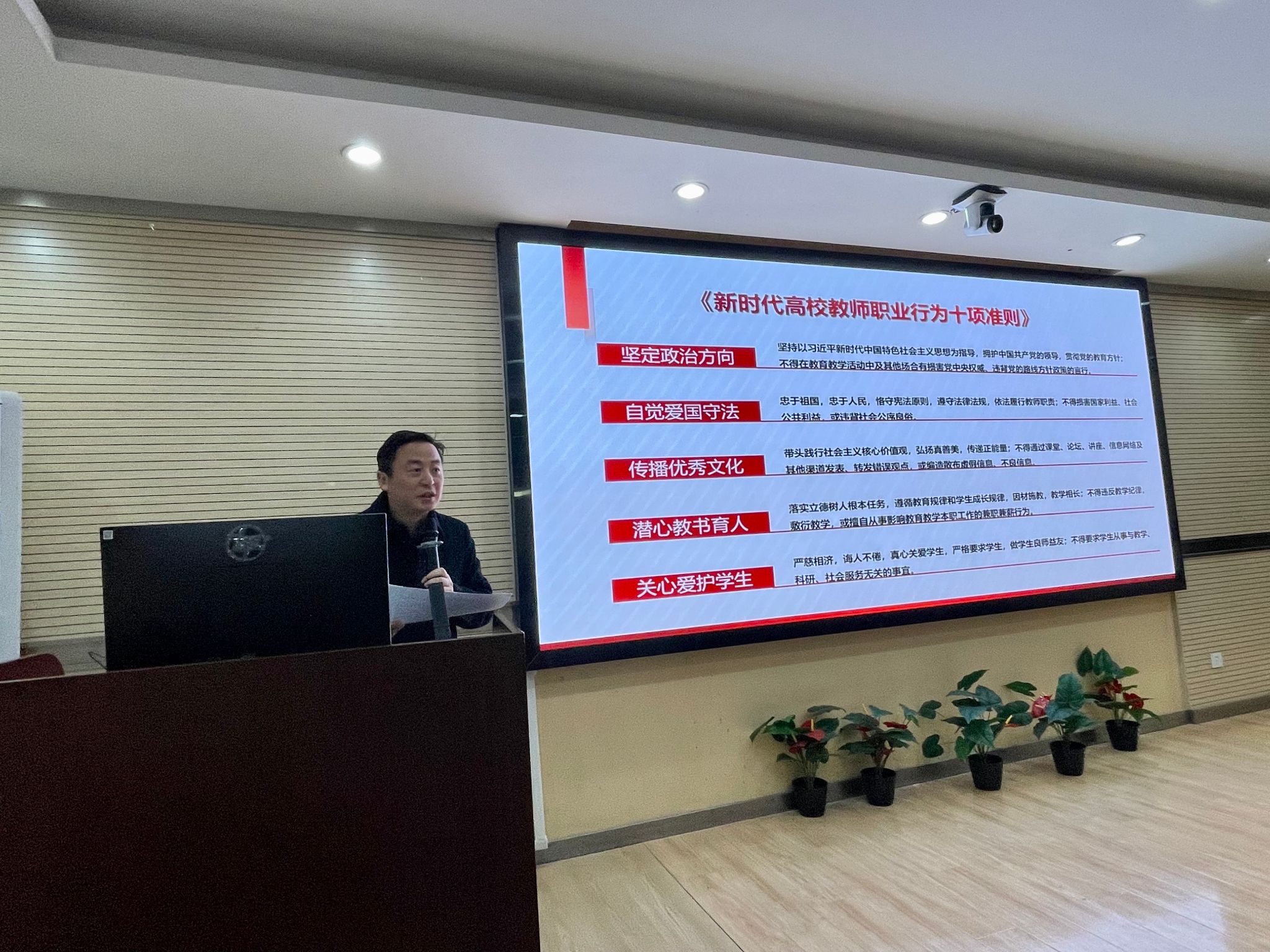 随后,赵明文带领全体教职工认真学习《新时代教师职业行为十项准则》,并逐条解读准则内容。他强调,作为教师要时刻铭记教书育人的神圣使命,全面贯彻党的教育方针,树立良好的教师形象,以案为鉴,恪守师德。