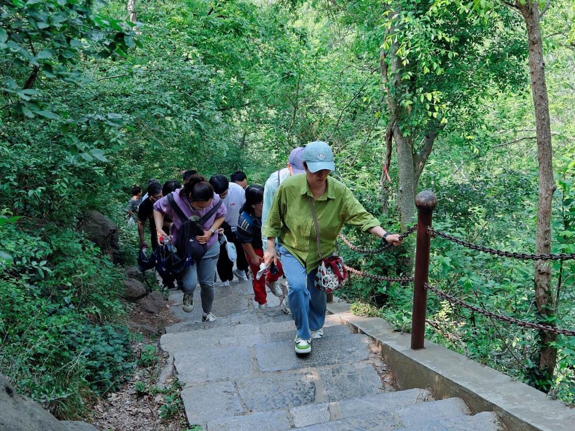 教师们选择方山著名的十八盘登山小道作为登顶线路。沿途,独特的火山地质地貌与烂漫山花相映成趣,教师们或驻足拍照记录春色,或结伴畅谈教学科研心得,经历一番跋涉,站在山顶,俯瞰全景,老师们感受清爽的山风拂面的同时,将城市与自然的交融尽收眼底。