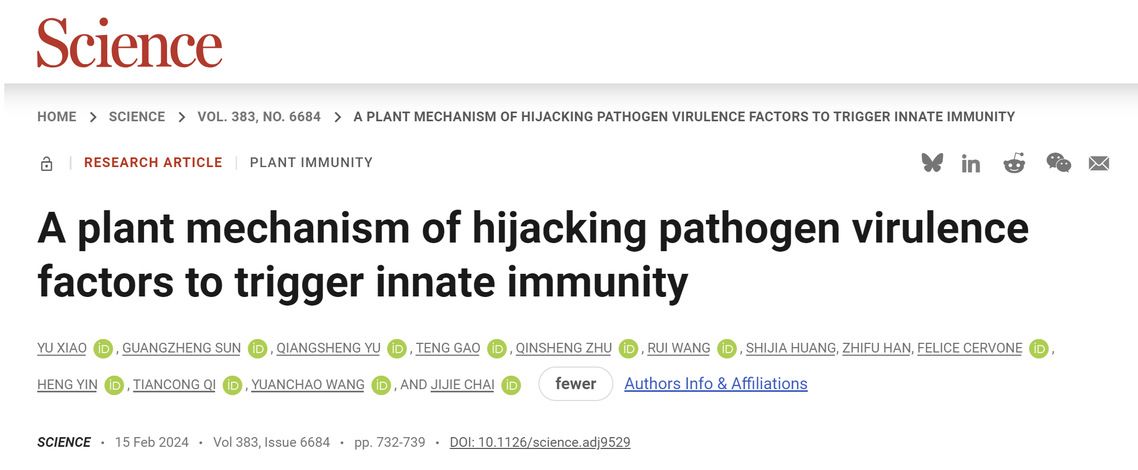 学校另一入选成果“A plant mechanism of hijacking pathogen virulence factors to trigger innate immunity”,由王源超教授团队和清华大学/西湖大学柴继杰教授团队合作完成,于2024年2月在 Science 发表。研究揭示了植物PGIP特异性识别病原菌PG并劫持其酶活性来触发植物先天免疫的独特分子机制,对认识植物免疫系统、合理利用和精准改造PGIP提高作物抗性具有重要的指导意义。