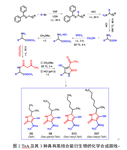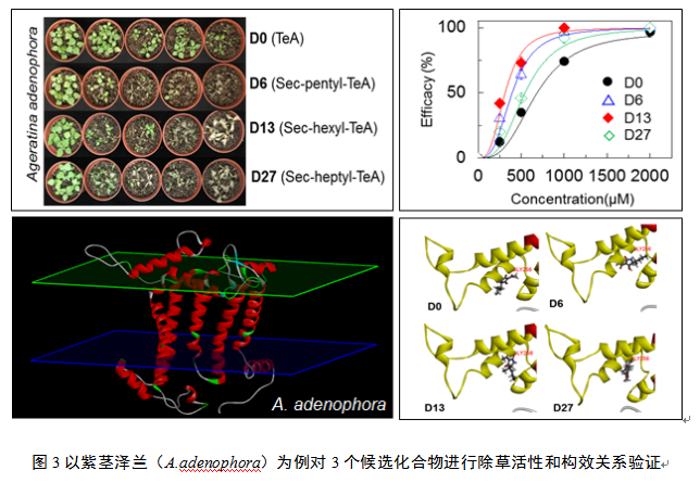 该论文基于TeA与拟南芥作用靶点D1蛋白的分子互作模型,以TeA为先导物对其5位的烷基侧链进行分子修饰,设计了一系列衍生物,通过分子对接和参数分析了数十个结构修饰化合物分子,从中筛选出3个高结合能的候选化合物(图1)。进一步基于实验室建立的合成方法(专利ZL200610038765.X和ZL201810359759.7)化学合成了3个化合物(图2),并对其进行了构效关系的研究和除草活性的验证,最终获得了2个高除草活性的化合物仲戊基TeA和仲己基TeA,其除草活性是TeA的2倍以上,显示出非常好的商业化前景(图3)。