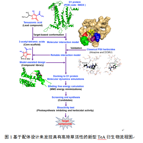 当前,化学除草剂的研发已由传统的非定向研发发展到现在的通过解析化学分子与作用靶点互作机制来实现高效定向分子设计的新阶段。利用自然界中化学结构多样、生物活性丰富、作用靶点独特的天然产物,借助计算生物学模拟合成研发新型生物源除草剂已成为除草剂开发的一个重要途径。该课题组于上世纪90年代在生物防治紫茎泽兰致病菌中发现TeA毒素,并利用其研发生物源除草剂,发现其具有广谱杀灭大多数单双子叶杂草、活性高(20-80ppm可以杀死杂草)、作用速度快(2-3天)、降解迅速低残留、结构简单等特点,有潜力开发为防除紫茎泽兰及其它杂草的生物除草剂。进一步系统开展了产毒条件、作用靶点和杀草机制、毒素生物合成工艺和化学合成工艺的研究。首次明确了TeA是一种全新的来源于真菌的光系统II抑制剂,其作用靶点是光系统II的D1蛋白。分子互作模型显示,在TeA和D1相互作用过程中D1蛋白上的256位氨基酸起着关键的作用,但其绑定行为不同于其他经典的光系统II抑制剂(如敌草隆和阿特拉津)。TeA与靶标杂草的D1蛋白结合后,会阻断光合电子传递链活性,引起过能量化,导致叶绿体活性氧迅速爆发,引起细胞死亡和组织坏死,最终迅速杀死杂草。相关研究成果已在Plant Cell Environ、BBA-Bioenergetics等国际著名期刊上发表论文30余篇,获得中国国家发明专利5项(ZL00112560.5,ZL03132322.7,ZL200510038263.2,ZL200610038765.X和ZL201410175454.2),日本发明专利1项(专利号4982384),美国专利2项(US8921274和US9926573)和欧洲发明专利1项(EP1997803)。目前,已经成功研发出25%TeA水剂(商品名丁羟咯酮),并获得了农业部田间药效批准证书,并推动商业化。