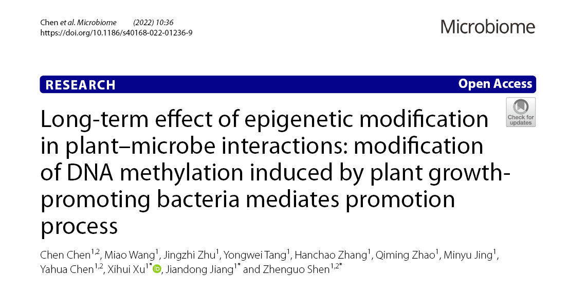 2022年2月24日,我校生命科学学院沈振国教授团队和蒋建东教授团队合作在国际权威学术期刊《Microbiome》上在线发表了题为“Long-term effect of epigenetic modification in plant–microbe interactions: modification of DNA methylation induced by plant growth-promoting bacteria mediates promotion process”的研究论文。该研究通过多维组学研究植物、土壤微生物组、植物促生菌之间的复杂互作关系,发现了植物生长促进细菌(PGPB)通过调控植物根部DNA甲基化而长效促进植物生长的新机制,首次提出PGPB-植物-微生物组互作的二阶段模型,为基于PGPB操控根际微生物组提供新的思路。