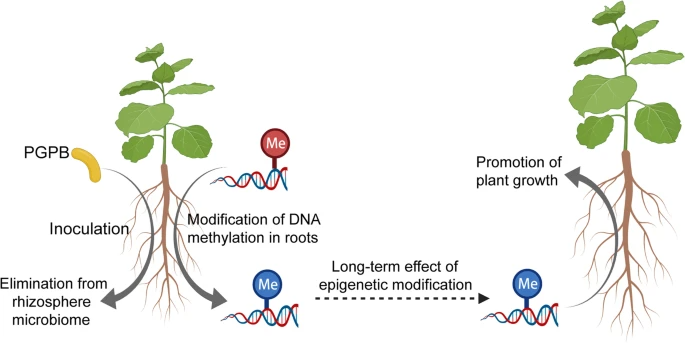这项研究提出了一种新的机制,PGPB在根部诱导的DNA甲基化修饰介导了植物促生过程,而且这些甲基化修饰在接种物消亡后仍然具有促生功能。这为微生物与植物的相互作用提供了重要的新见解,并超越“维持土壤中接种物持久性的观点”提出了植物-微生物组操控的新策略。