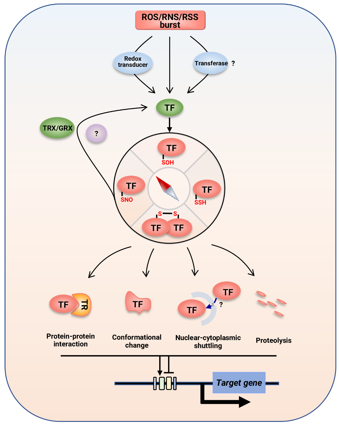 图3:OxiPTMs调控转录因子功能的生化机制和调节方式