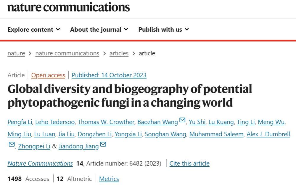 2023年10月14日,国际权威学术期刊Nature Communications在线发表了生科院蒋建东教授与多国科研团队的合作研究成果,题为“Global diversity and biogeography of potential phytopathogenic fungi in a changing world”。