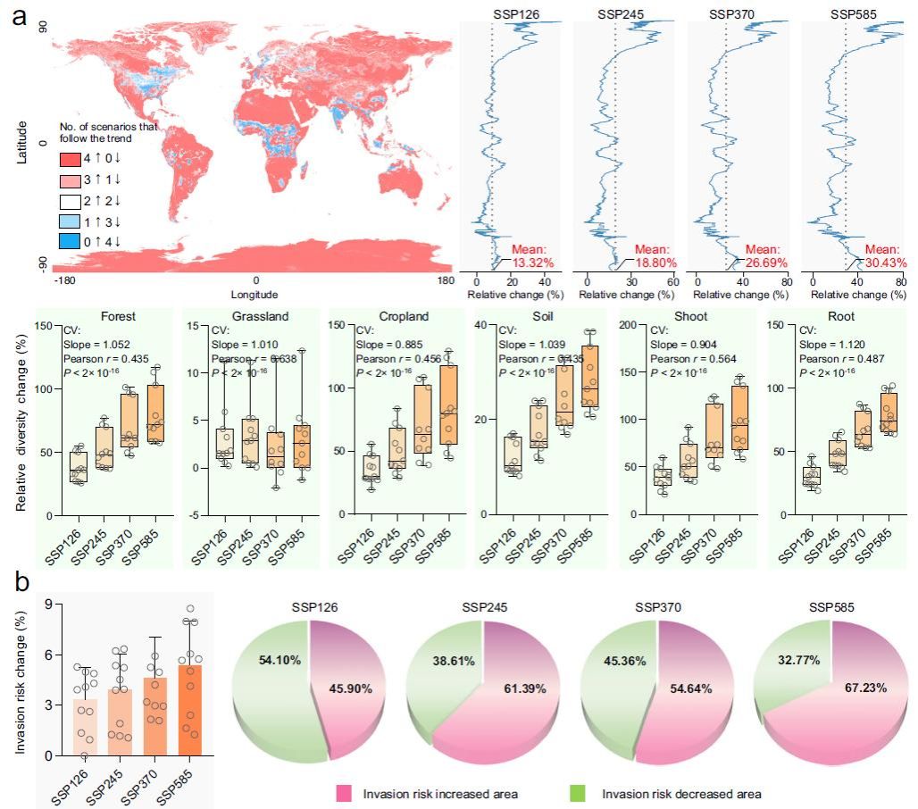 植物病原真菌威胁着全球粮食安全,但其全球多样性和生物地理学的生态驱动因素仍然未知。研究团队构建并分析了全球潜在植物病原真菌图谱,该图谱来自各大洲和主要海洋岛屿地区、11种土地覆被类型和12种生境类型的20312个样本。研究发现,植物病原真菌的多样性在中纬度地区达到顶峰,这与在地上生物中观察到的纬度多样性梯度形成鲜明对比。基于机器学习的随机森林模型表明,生物气候是植物病原真菌全球分布的重要驱动因素。研究团队还对本世纪末的植物病原真菌分布情况进行了预测,结果显示,到 2100 年,植物病原真菌的多样性和入侵潜力将在全球范围内增加。重要的是,植物病原真菌的多样性在森林(37.27-79.12%)和耕地(34.93-82.51%)生态系统中大幅增加,且在未来依赖化石燃料的工业情景下增幅将更加明显。因此,研究团队建议改进森林和耕地的生物监测,优化可持续发展方法,以减少植物病原真菌的潜在威胁。
