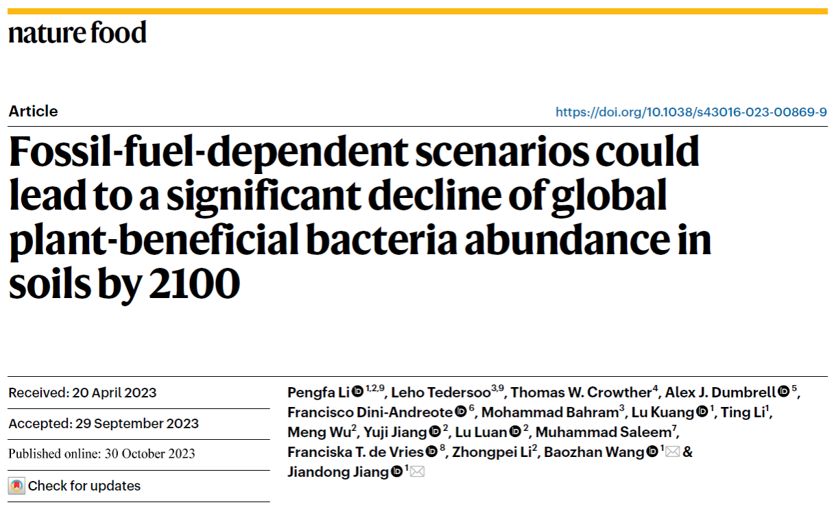 2023年10月30日,国际权威学术期刊Nature Food在线发表了南京农业大学生命科学学院蒋建东教授团队的最新研究成果,题为“Fossil-fuel-dependent scenarios could lead to a significant decline of global plant-beneficial bacteria abundance in soils by 2100” (2023, DOI: 10.1038/s43016-023-00869-9; https://www.nature.com/articles/s43016-023-00869-9),揭示了植物有益细菌的全球分布格局与驱动因素,预测出高化石燃料消耗的发展模式下全球植物有益细菌的相对丰度将显著下降,并建议采取基于低排放、碳中和的可持续社会发展路径是维持有益细菌保障全球粮食安全、促进农业可持续发展的有益策略。