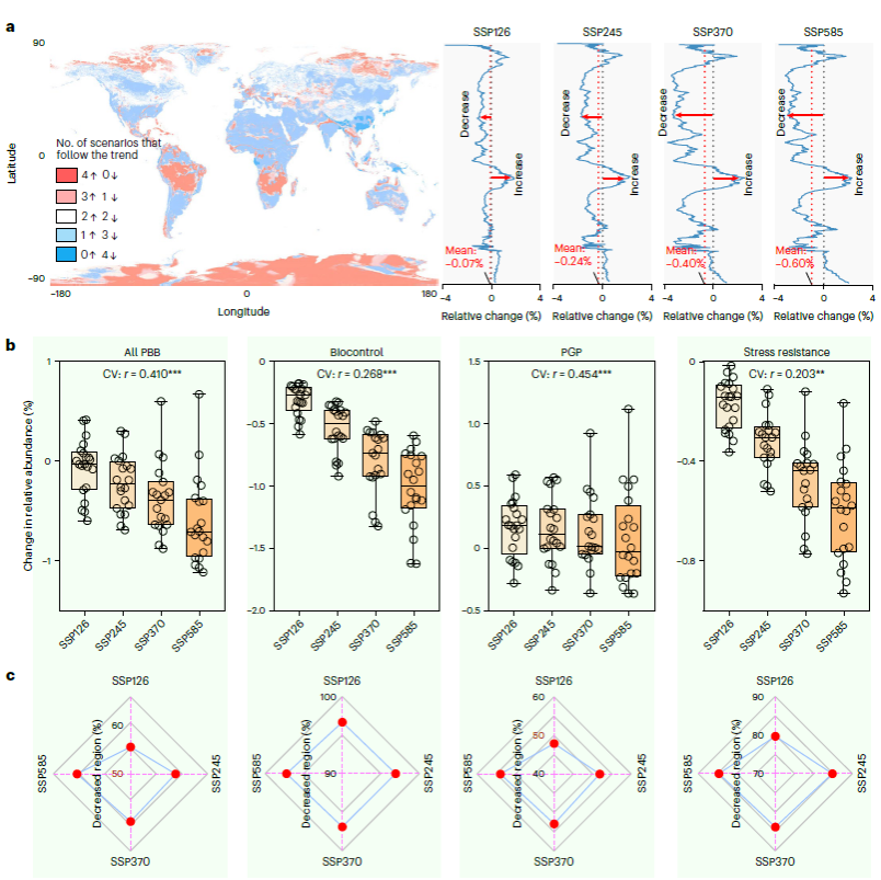 一直以来,化肥和化学农药在农业生产中的过量施用为生态环境和人类健康带来重大威胁。充分挖掘和利用微生物的有益性状,进而降低化肥、农药的施用,或可为农业可持续发展带来新的机遇。研究团队基于微生物的三大类植物有益性状(生防、促生、抗逆),开发了首个全球最大的植物有益细菌数据库(包含来自135个科的396个细菌属,同时也建立了包含来自57个属258个种的植物病原细菌清单),并利用地球微生物组计划(EMP)释放的测序数据对植物有益细菌的全球地理分布和未来变化进行了探究。研究表明,植物有益细菌的多样性在低维度地区最高,存在明显的纬度多样性梯度。植物有益细菌的全球分布主要受环境过滤控制,而气候是最重要的影响因素。预测模型显示,到本世纪末,土壤中植物有益细菌的相对丰度将出现明显下降,尤其是生防细菌(-1.03%)和抗逆细菌(-0.61%)的相对丰度下降尤为显著。该研究构建的本地化的植物有益微生物数据库可为植物微生物组的高效、精准合成提供理论指导和技术支撑。