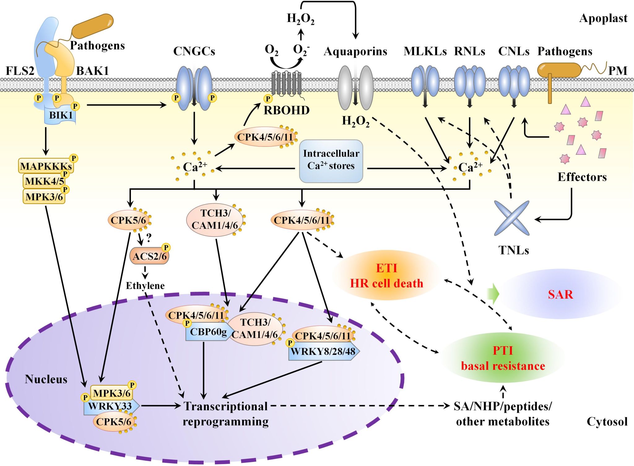 植物先天免疫系统具有两种主要的免疫机制:模式诱导免疫(pattern-triggered immunity,PTI)和效应子诱导免疫(effector-triggered immunity,ETI)。PTI和ETI展现出部分重叠的免疫反应,比如细胞内Ca2+内流、活性氧爆发、丝裂原活化蛋白激酶激活、转录重编程和植物防御相关激素的产生。有研究表明二者可以形成相互增强的免疫反应回路。