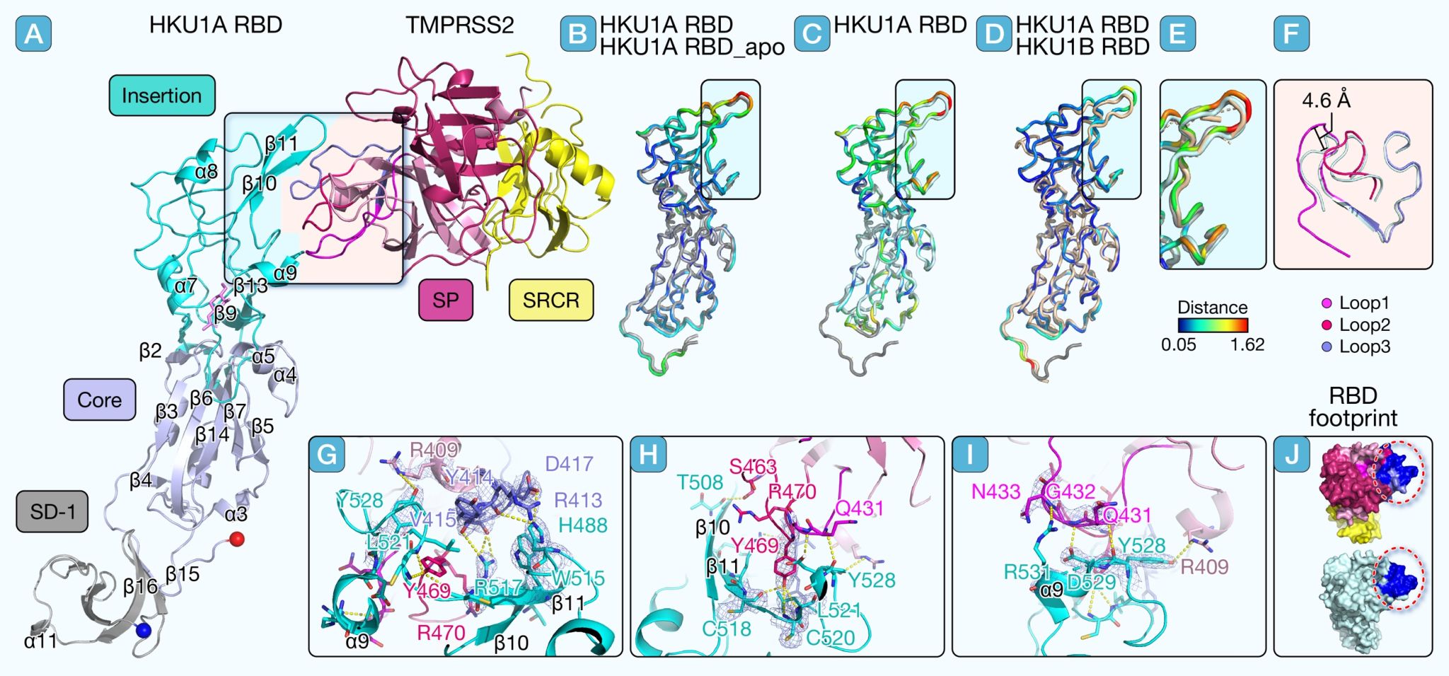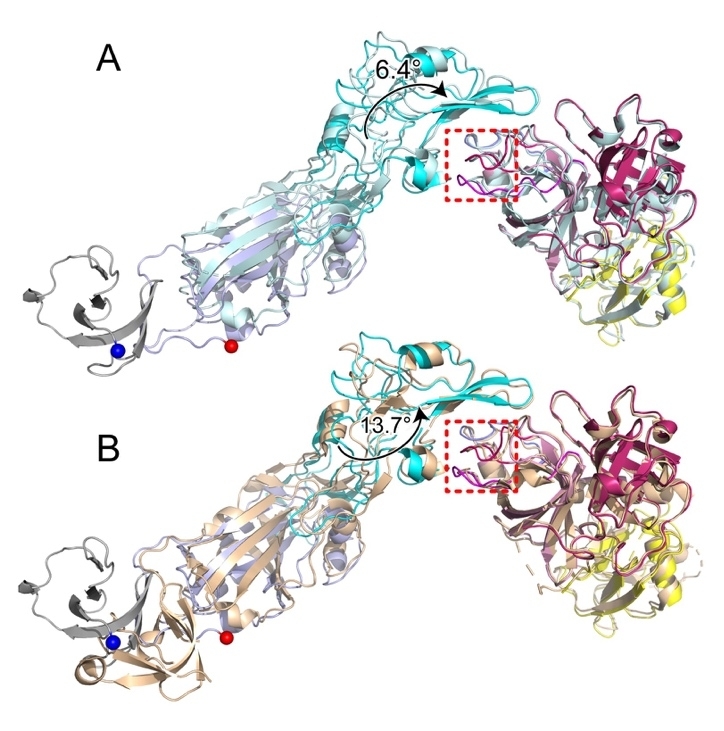 在张教授课题组的结构中,HKU1A RBD 结合 TMPRSS2 的方向显示出与最近解析的其他复合物结构有显著差异。与HKU1A RBD-TMPRSS2复合物的冷冻电镜结构(PDB: 8VGT)和HKU1B RBD-TMPRSS2复合物的晶体结构(PDB: 8S0M)相比,HKU1A RBD分别旋转了6.4°和13.7°,表明 HCoV-HKU1受体结合的可塑性和复杂性。