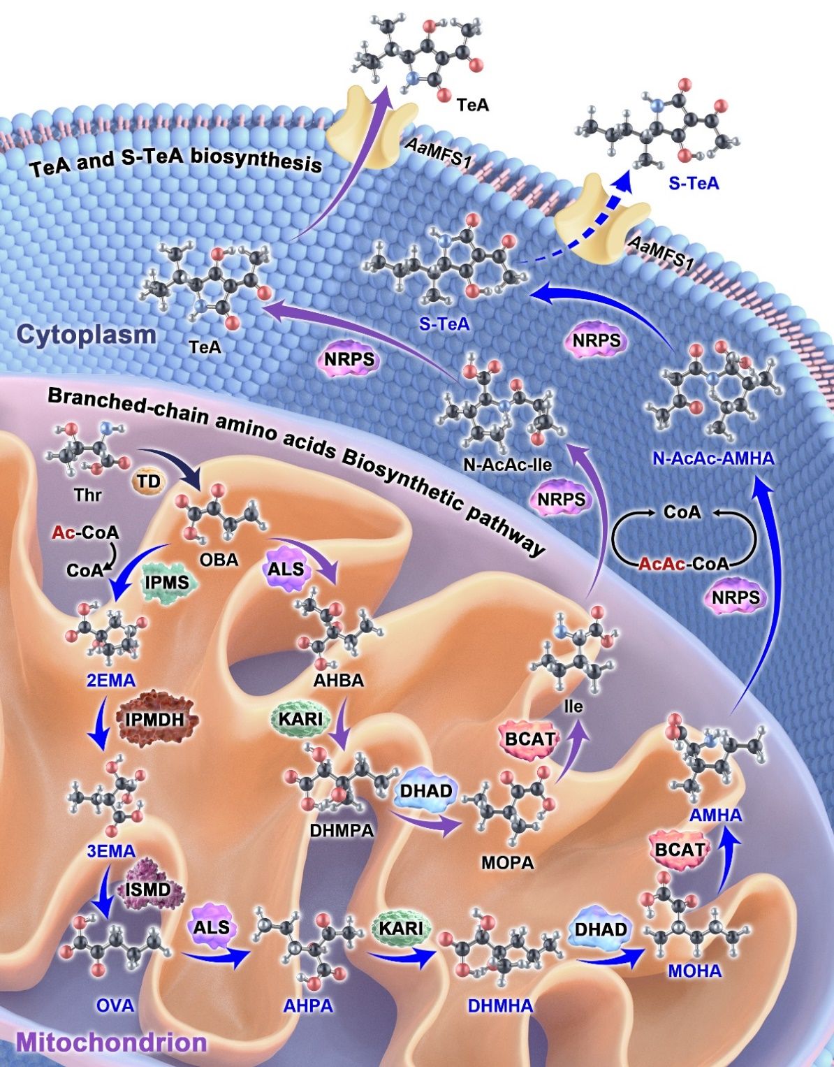 同时,本研究利用多组学、同位素示踪、质谱、蛋白重组等手段明确了S-TeA是以苏氨酸为起始原料,先通过支链氨基酸合成途径中8个酶在线粒体中合成直接前体AMHA(2-氨基-3-甲基己酸),随后AMHA在细胞质中被NRPS-PKS(非核糖体肽合成酶-聚酮合酶)乙酰化和环化形成S-TeA,最后通过跨膜蛋白AaMFS1将S-TeA排到胞外的合成机制。其中,2-异丙基苹果酸合成酶(IPMS),3-异丙基苹果酸脱水酶(IPMDH)和异丙基苹果酸脱氢酶(ISMD)是AMHA生物合成途径特有的酶,而IPMDH是关键限速酶。AMHA已经被证实是一种天然发生的非蛋白氨基酸,具有抗逆、促生、提质、缓解药害等功能,已获得多项发明专利授权和新农药命名“氨甲己酸”,有潜力开发成我国具有完全自主知识产权的植物诱抗剂新产品。本研究对真菌中AMHA生物合成途径及机制的解析,为基于合成生物学构建AMHA高产工程菌株、实现其高效生物制造奠定了坚实的理论基础。