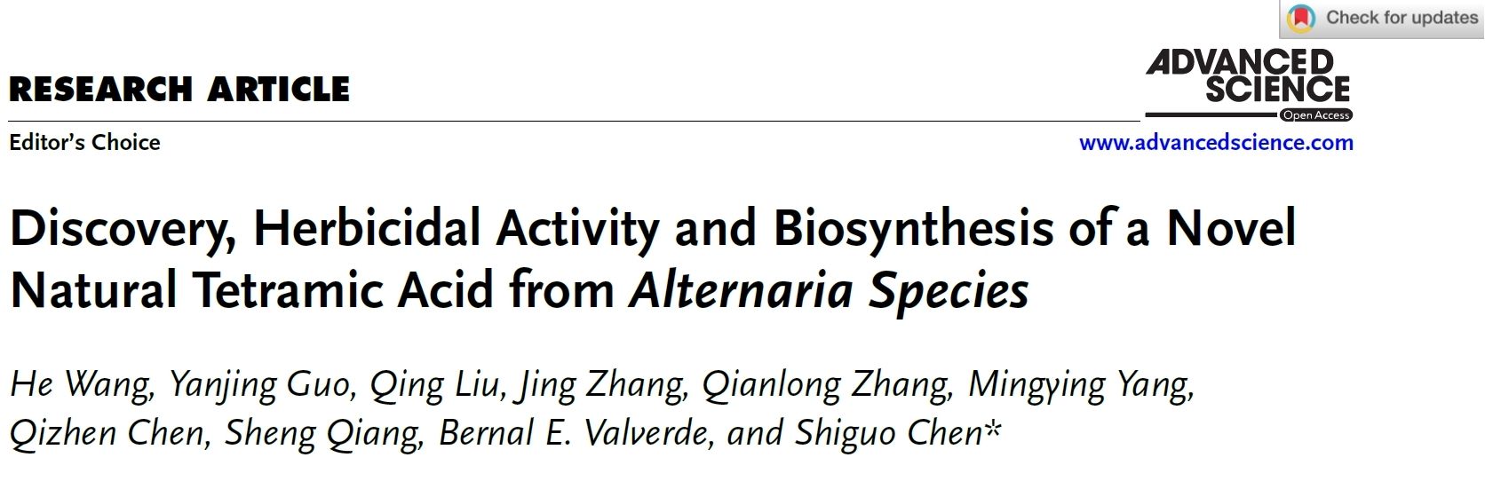 2025年4月25日,南京农业大学生命科学学院陈世国教授课题组在国际学术期刊《Advanced Science》上发表了题为“Discovery, Herbicidal Activity and Biosynthesis of a Novel Natural Tetramic Acid from Alternaria Species”的研究论文(Editor’s Choice Article)。该研究发现了一种新型tetramic acid类天然产物sec-pentyl-tenuazonic acid(S-TeA),揭示了其在真菌Alternaria alternata中的生物合成途径及机制。