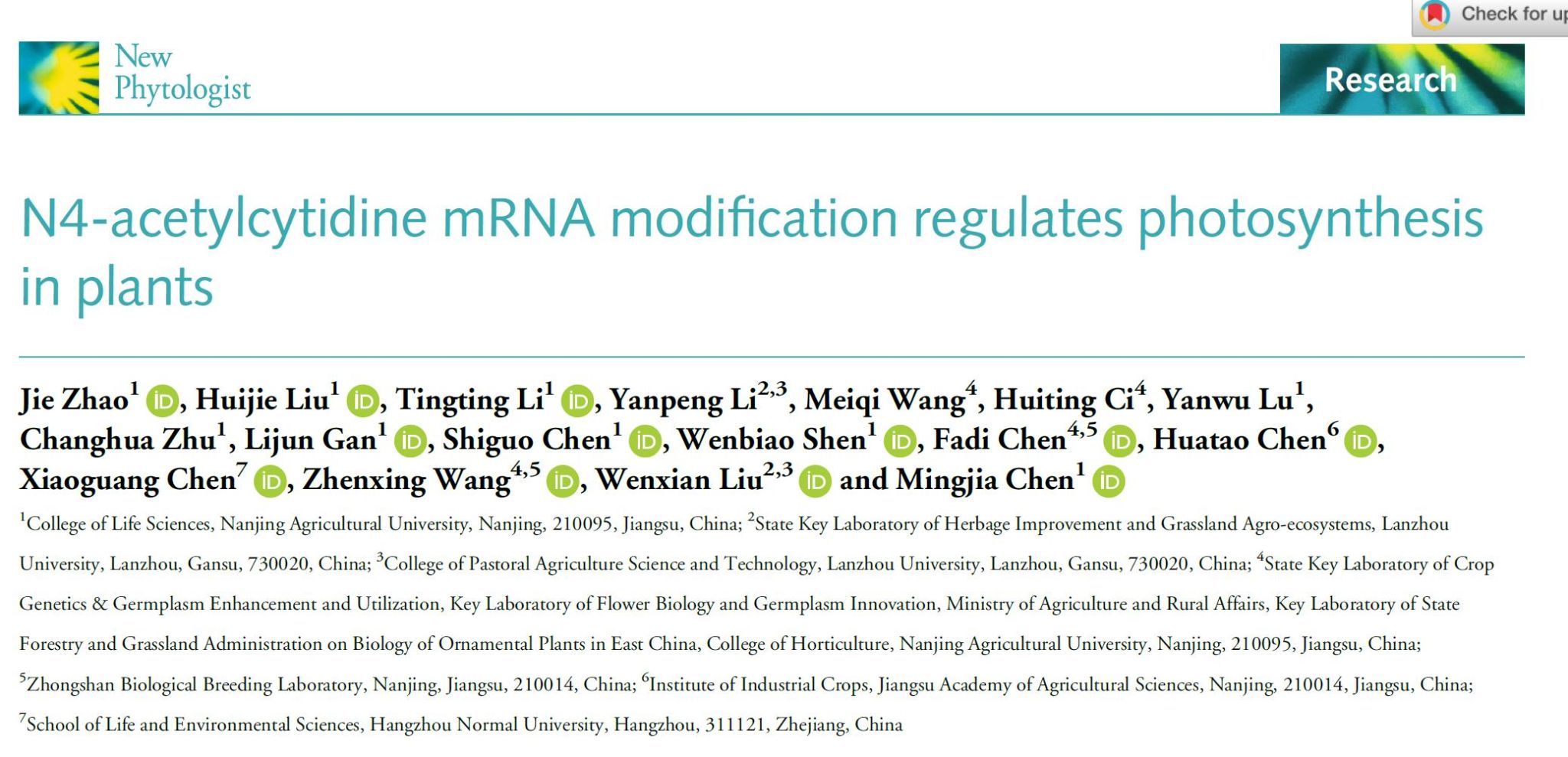 近日,南京农业大学生命科学学院陈铭佳课题组联合我校园艺学院菊花遗传与种质创新团队以及兰州大学相关人员在国际权威学术期刊New Phytologist上发表了题为“N4-acetylcytidine mRNA modification regulates photosynthesis in plants”的研究性论文。该论文了首次绘制了多种高等植物高分辨率的全转录本RNA乙酰化(ac4C)修饰图谱,揭示了该新型RNA修饰促进植物光合作用的分子机制。