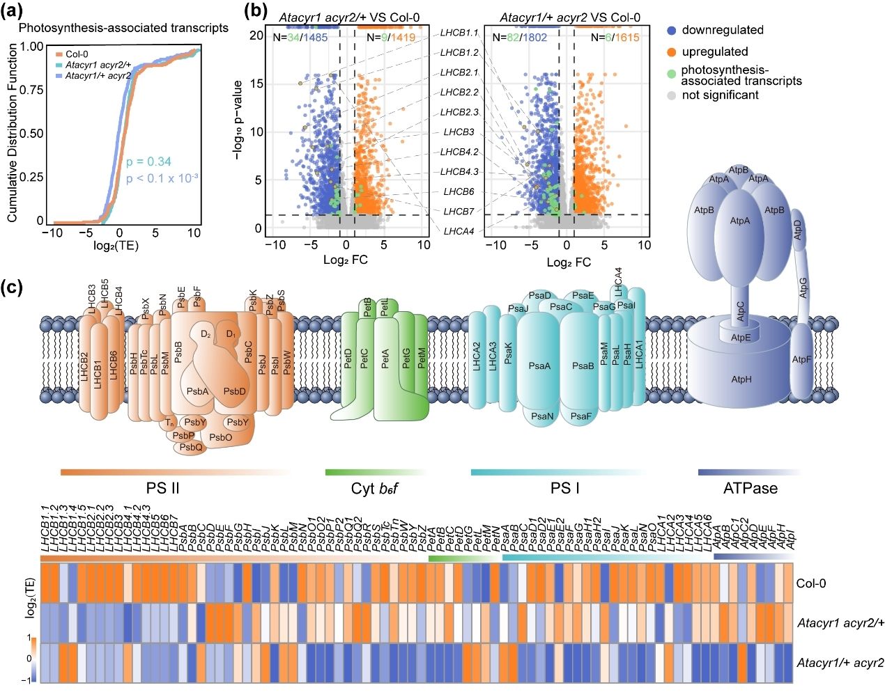 高等植物中,ac4C修饰是由RNA乙酰转移酶ACYR (N-ACETYLTRANSFERASEs FOR CYTIDINE IN RNA) 催化形成的。研究团队通过acRIP-seq、Ribo-seq和RNA-seq等技术进行多组学联合分析,发现缺失ACYR会导致光反应传递链相关转录本(包括光捕获复合体家族成员LIGHT HARVESTING COMPLEX II 2 (LHCB2)、LHCB3和LHCB4)的翻译效率显著降低,进而降低了相应编码蛋白产物的丰度。