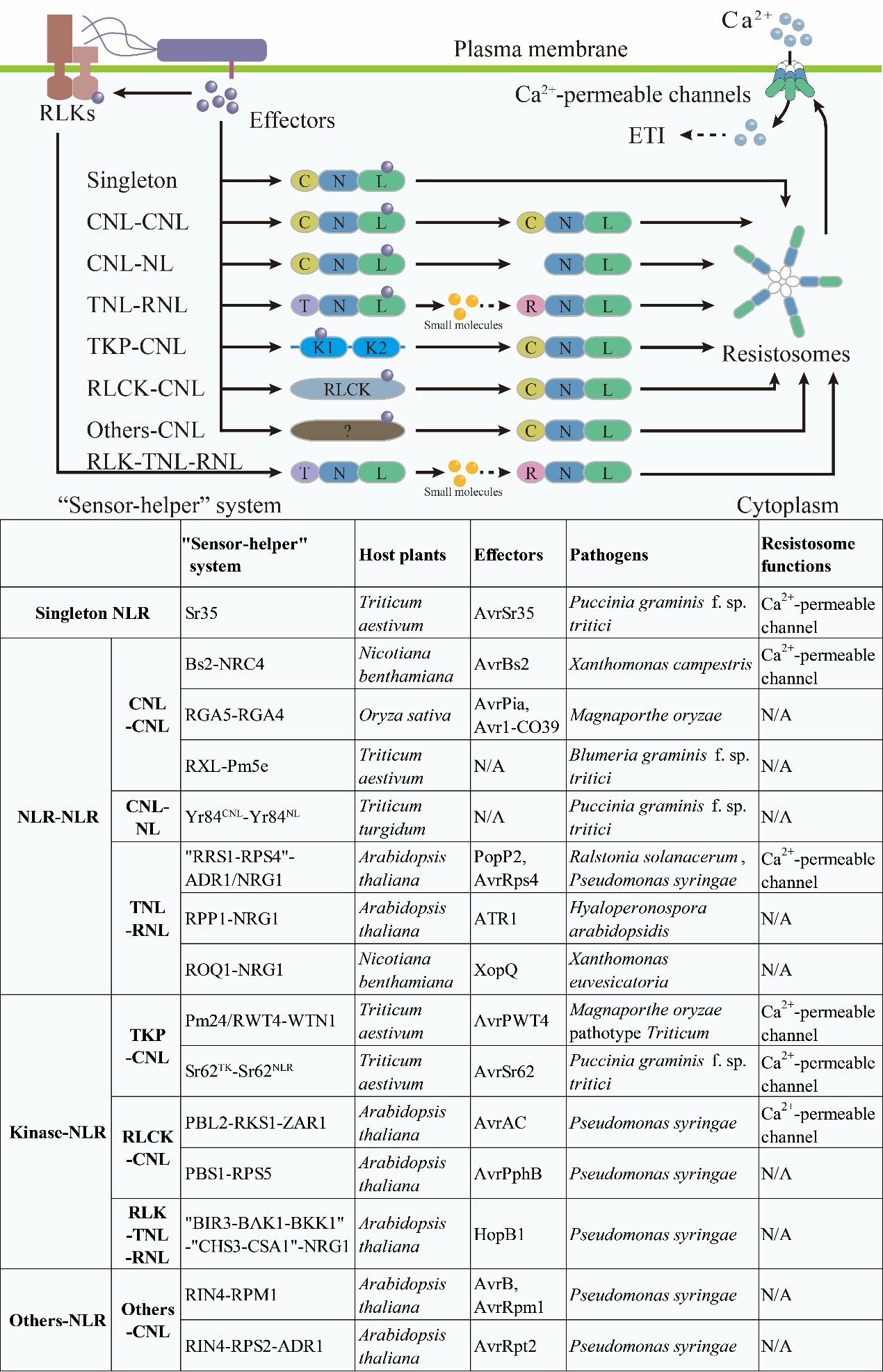 TKP-NLR模块中,TKP蛋白通过激酶结构域直接识别病原菌效应蛋白,而配对的NLR类抗病蛋白则迅速启动免疫信号。该机制不仅能高效抵御小麦白粉病、秆锈病和麦瘟病等真菌病害,还具有结构多样性与进化适应性,为作物分子育种提供了广谱抗性新途径。无论是单一型NLR(singleton NLR)还是“传感器-辅助器”,最终都通过形成钙离子通道引发钙离子快速且持续的内流,进而激活效应蛋白触发的免疫反应(effector-triggered immunity,ETI),表明钙离子信号在植物免疫中具有重要地位。