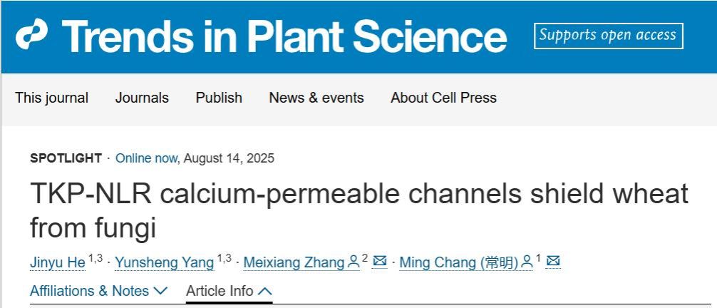 近日,南京农业大学生命科学学院常明教授课题组与陕西师范大学生命科学学院张美祥教授合作,在《Cell》子刊《Trends in Plant Science》在线发表综述论文 “TKP-NLR Calcium-Permeable Channels Shield Wheat from Fungi”。该论文一方面系统总结了小麦“串联激酶蛋白-NLR类抗病蛋白(TKP-NLR)”在抗真菌病害中的工作机制,另一方面对植物抗病基因的“传感器-辅助器(sensor-helper)”模型进行了重新分类与系统概括,为深入理解植物免疫系统提供了新视角。
