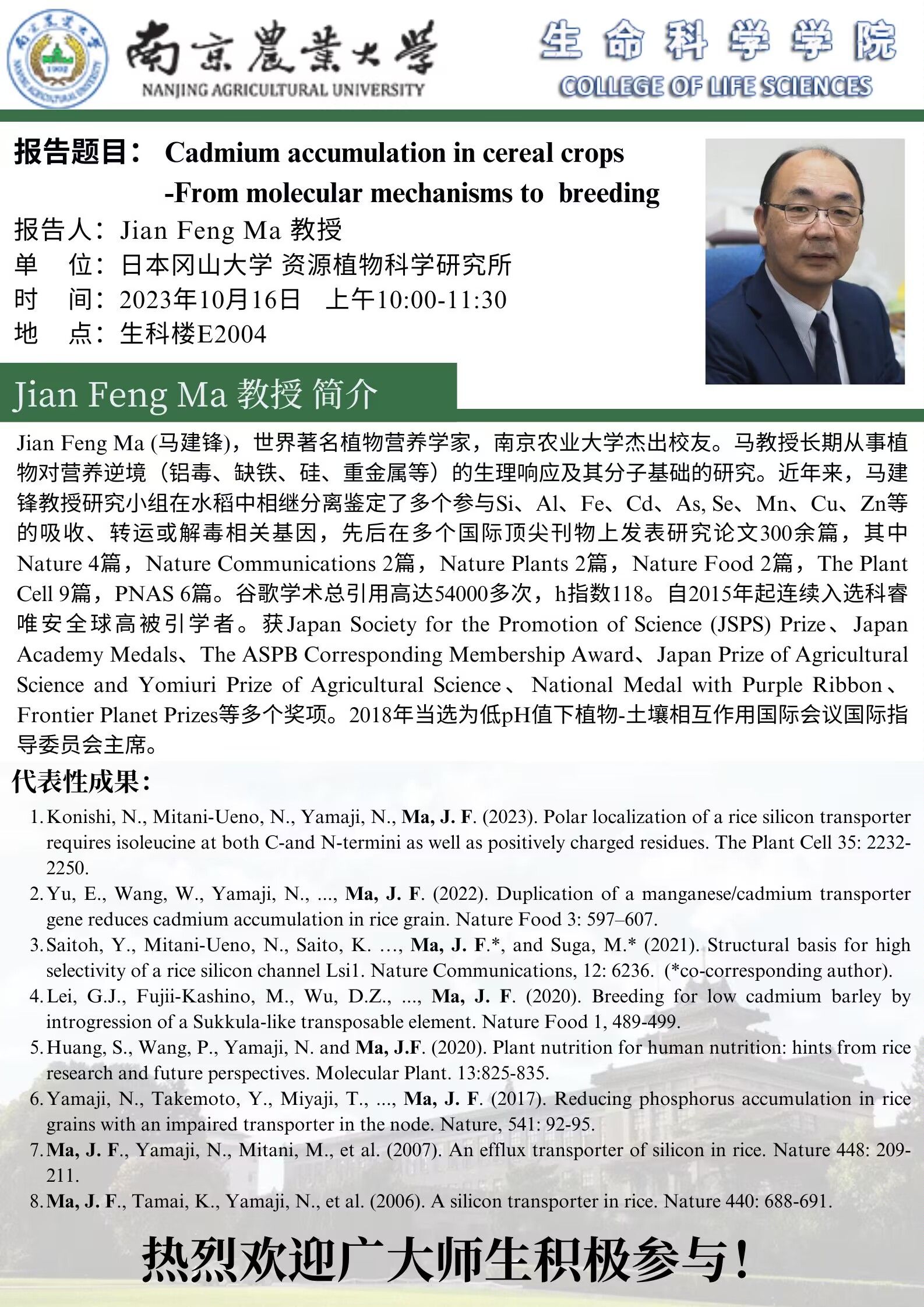 日本冈山大学资源植物科学研究所Jian Feng Ma教授将于10月16日在我校作报告