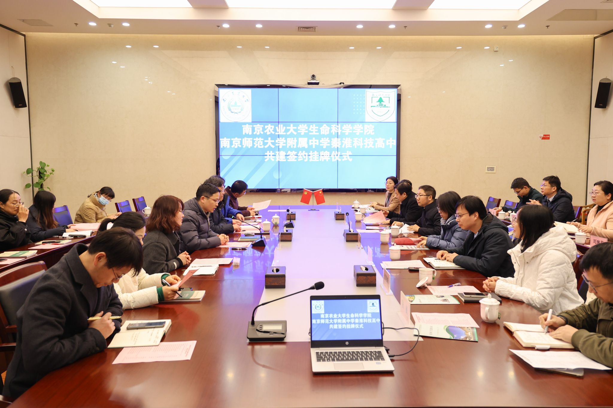 12月12日下午,南京农业大学学生工作处处长熊富强,教务处副处长祖海珍,南京农业大学生命科学学院党委书记赵明文,院长蒋建东,党委副书记李阿特,副院长张群,实验中心支部书记何琳燕,实验中心主任陆巍及教师戴伟民、刘琳莉、成丹,教学秘书刘园园及辅导员宛涛一行,前往南京师范大学附属中学秦淮科技高中(以下简称南师附中秦淮科技高中)参加共建签约与挂牌仪式。