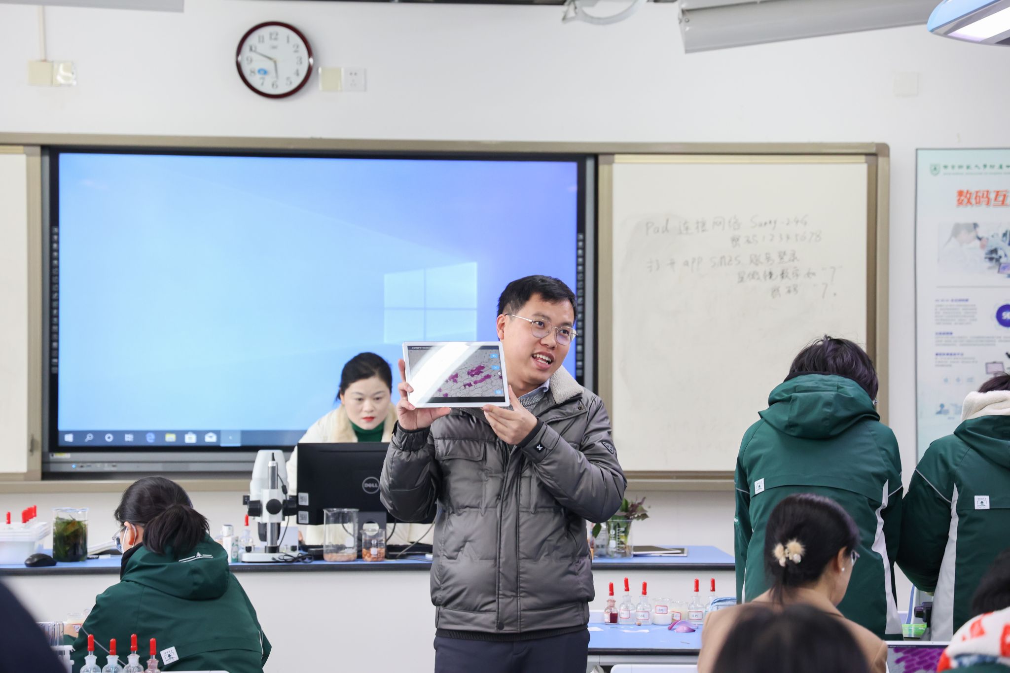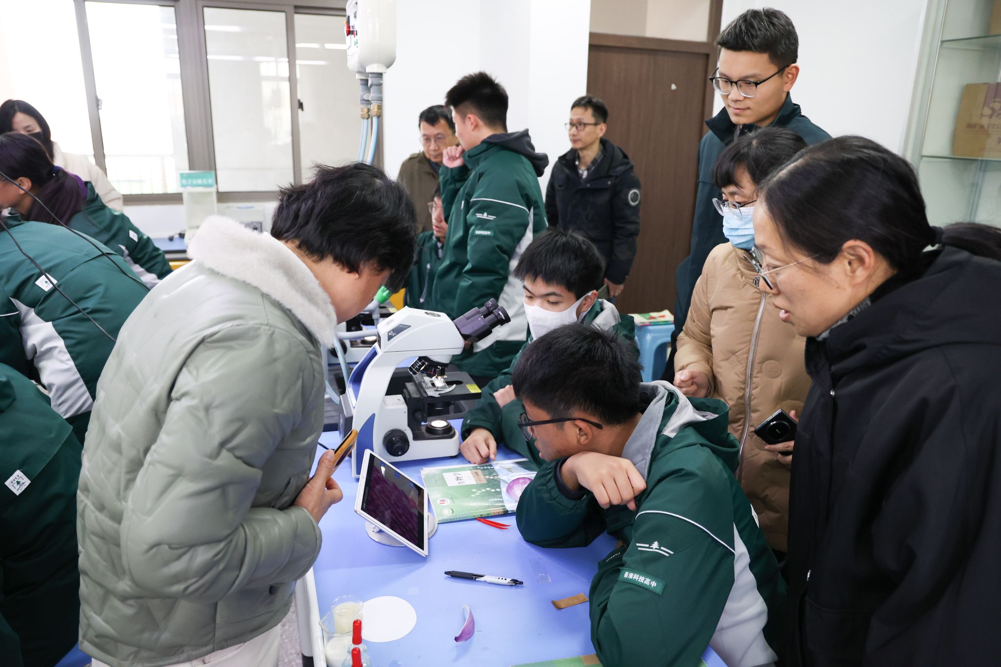 一行人下午到达南师附中秦淮科技高中并首先于生物数码实验室观摩该校高一生物组老师周东东的实验课。周东东通过数码显微技术,为学生讲解了“探究植物细胞的吸水和失水”等三个小实验,同时,两校教师也互相配合,共同指导学生们积极参与并引导同学们顺利完成实验过程。本次实验课程展示促进了中学教育与大学教育相衔接,充分体现了智慧课堂高效的学习生态环境。今后我校将继续探索建立与中学联合培养青少年科技创新人才的有效模式,为青少年科技创新人才不断成长和涌现营造良好的社会氛围。